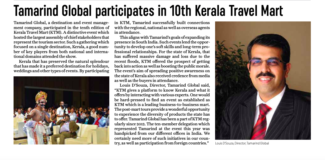 Tamarind Global, a destination and event management company based in Mumbai, will soon be opening offices in the USA and the UK for tours, wedding and events. Also, the company will be re-launching its B2B online portal on a larger scale both in India and overseas with more competitive products for the B2B market